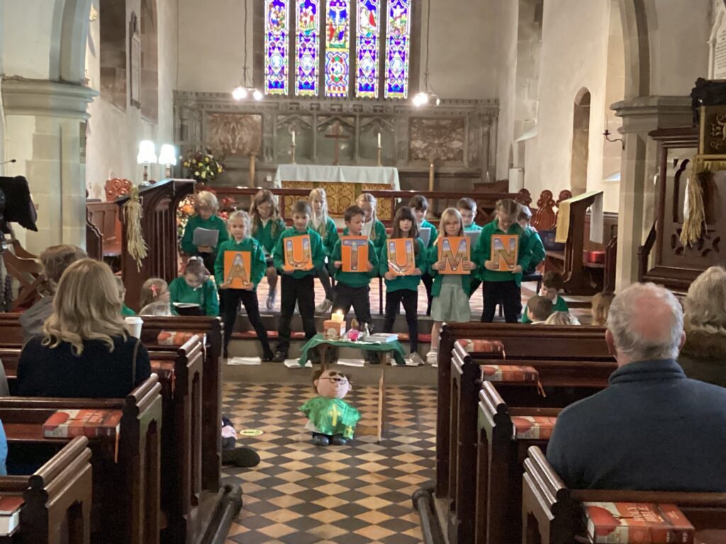 Some of the class 1 children read out lines from their acrostic prayers, spelling out the word autumn, whilst others gave suggestions of what they were thankful for this season.