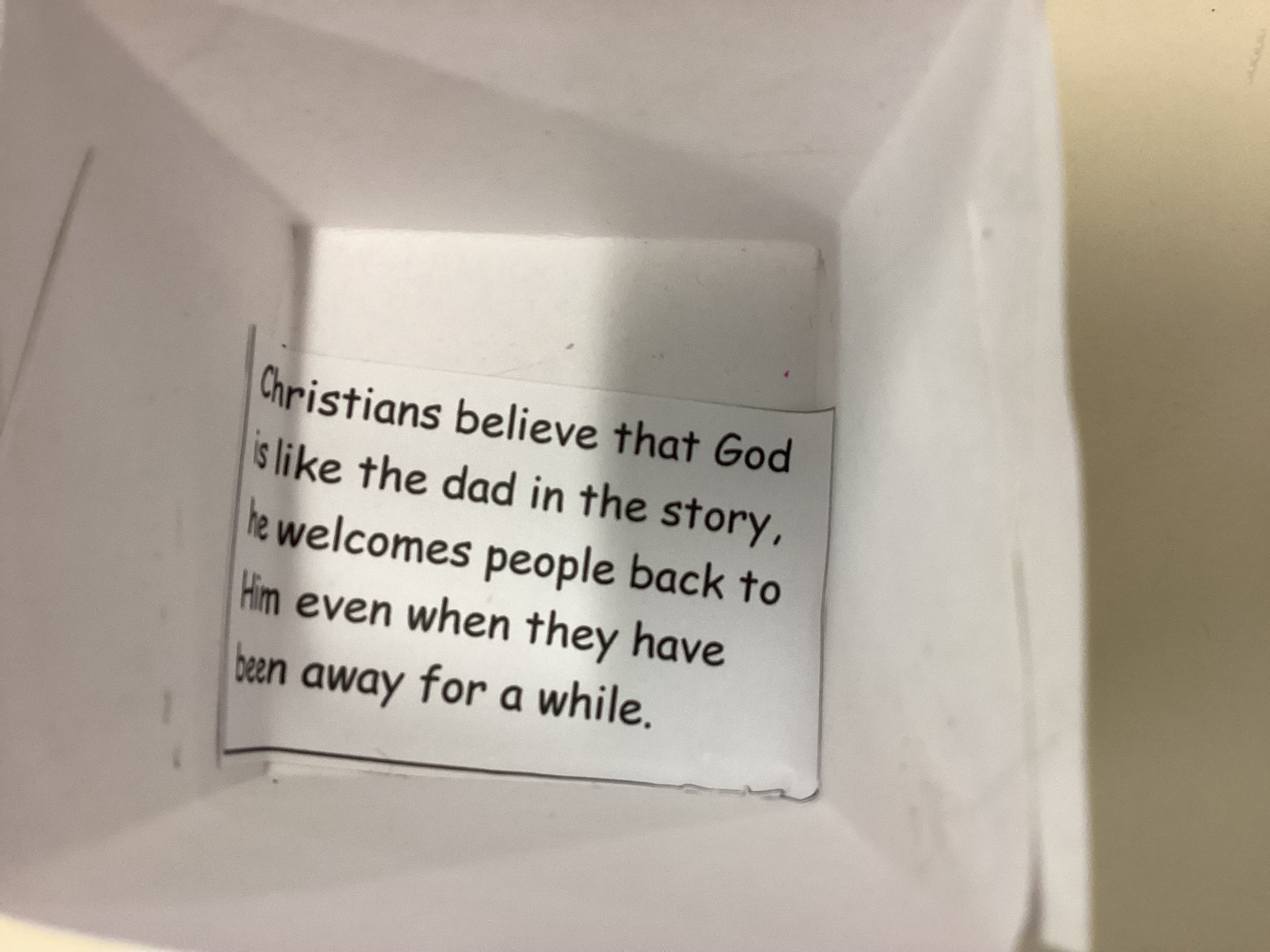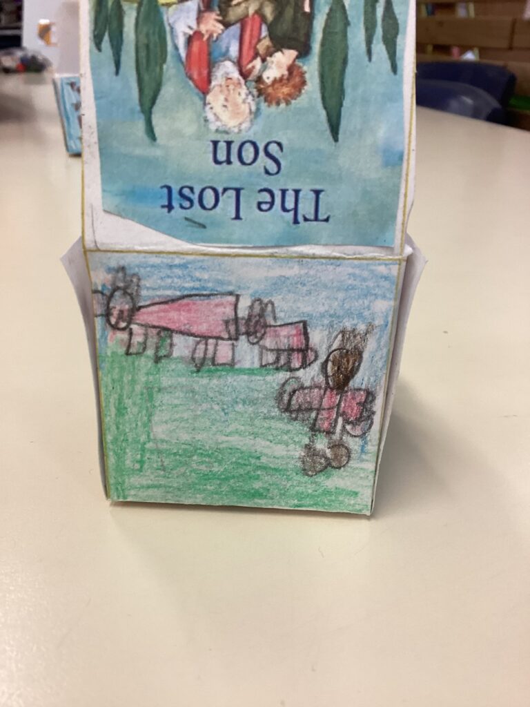 Using the Bible story of the Prodigal son we developed our knowledge of the Christian belief that God is like the father in this story, He is loving, kind, forgiving and fair. We made our own hidden meaning boxes to show scenes from the story to help us recall this.