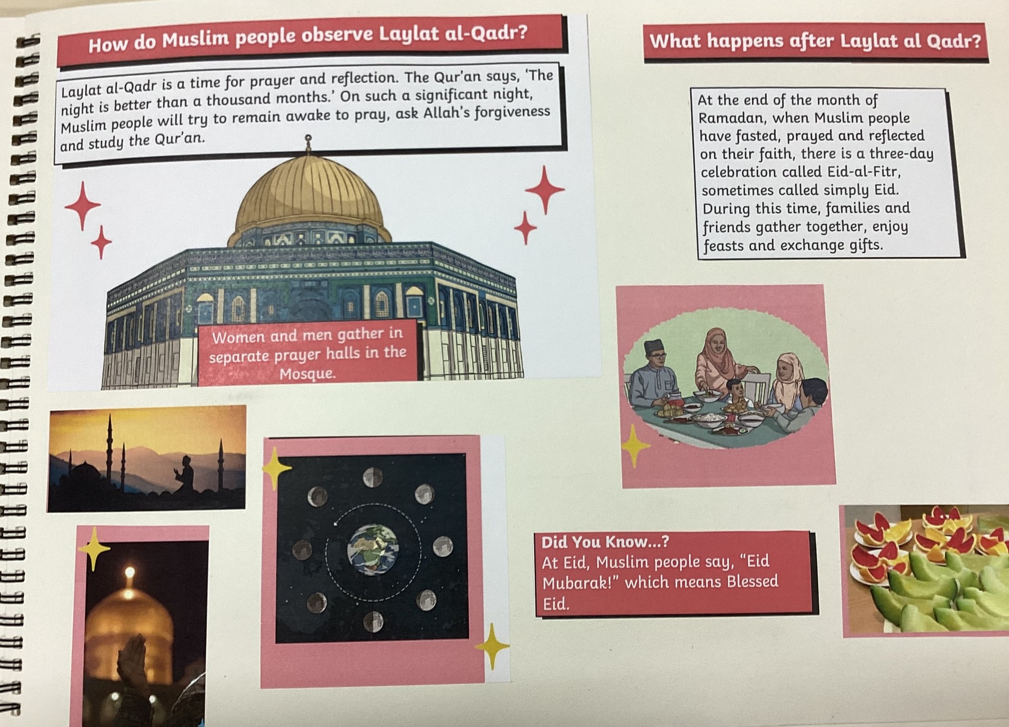 During our next sessions, we explored the impact of prayer and thought about what is needed to help believers pray. During those sessions, Year 3s and 4s designed their own prayer space and Year 5s and 6s, looked at arguments for and against providing a safe prayer space at work. We have also explored the key prayers in the three religions – their key words and their meaning.