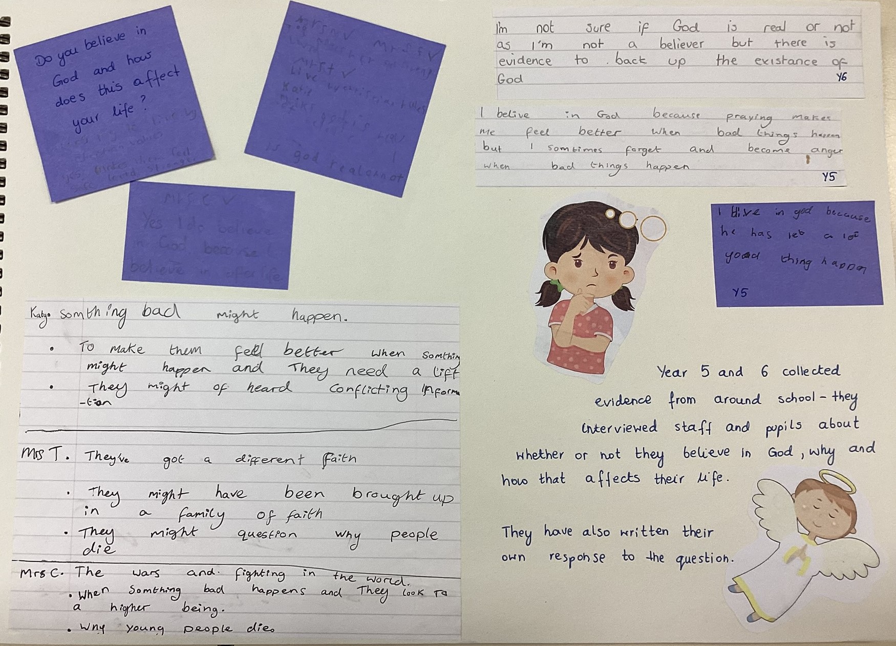 Year 1 and 2 children thought about ‘If God does exist and He looked at the world now, would He still feel happy?’ Some ideas that were shared included ‘Yes, because people are beginning to protect the world.’ ‘No, because people have built towers and tall sky scrapers.’